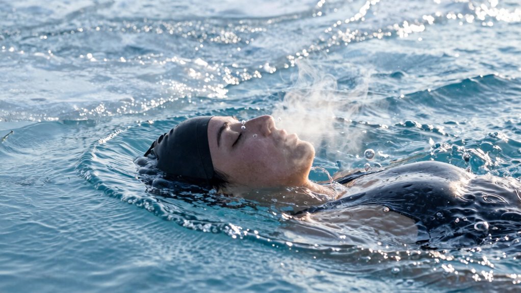 When you suddenly plunge into cold water, your body perceives it as a threat, triggering a stress response that can lead to panic. This is known as cold shock, which causes an immediate surge of adrenaline and rapid breathing. Your heart races, and your instinct may be to breathe rapidly and uncontrollably, fueling the panic response. Cold shock can also cause involuntary gasping, increasing the risk of inhaling water. Staying calm is essential to avoid this spiraling reaction. Practicing calm breathing techniques helps counteract the body’s instinctive panic response. By controlling your breath, you signal to your nervous system that you’re not in danger, reducing anxiety and preventing the onset of panic during cold water immersion. Engaging in free floating techniques can help you stay relaxed and maintain control in such situations. Additionally, understanding the body’s natural stress response can empower you to better manage your reactions in cold water.