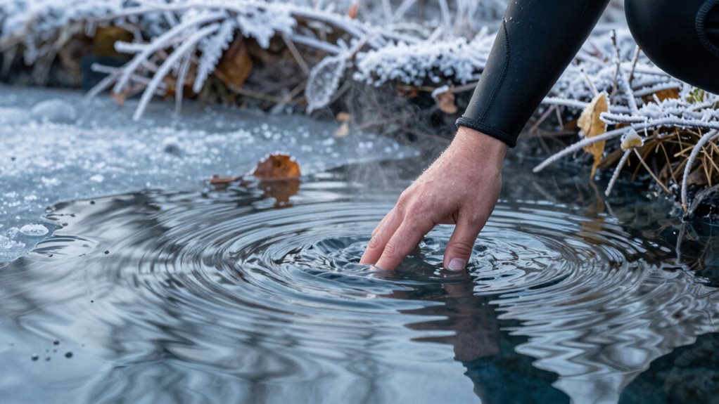 Start with a quick, comfortable plunge—about 1 to 3 minutes—to build your bravery. As you brave the cold, breathe deeply using breathing techniques to boost your mental resilience. Gradually extend your stays, listening to your body’s signals. Staying too long can cause discomfort, but a brief, brave burst helps boost your confidence and calms catastrophe thoughts. Consistency cultivates courage, so keep practicing to improve your mental toughness.