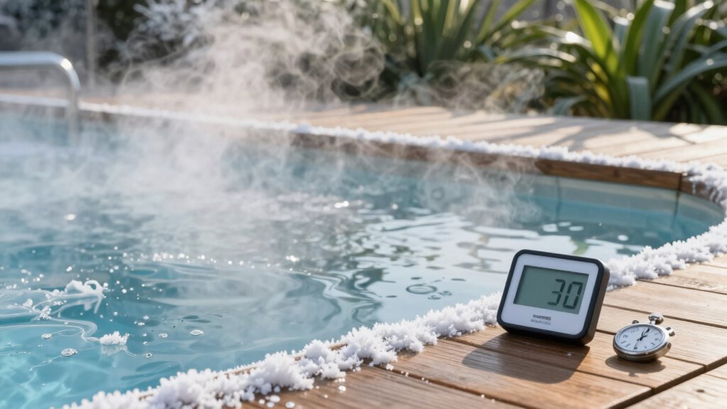 Cooling water for a cold plunge typically takes anywhere from 4 to 24 hours, depending on the starting temperature, the volume of water, and the cooling method used. During this process, maintaining proper water circulation is essential to guarantee even cooling and prevent stagnation. Good circulation helps distribute the cold evenly throughout the tank, and integrating smart automation controls can further enhance temperature regulation. Additionally, you need to monitor the chemical balance, especially pH and sanitizer levels, to keep the water safe and clear as it cools. Proper temperature regulation is crucial for an efficient cooling process and maintaining water quality. Consistent circulation not only helps achieve a uniform temperature but also supports the energy efficiency of the cooling system, reducing overall operational costs. Implementing automation controls can optimize the cooling process and ensure precise temperature adjustments. Regularly checking and adjusting the cooling system settings can significantly improve the cooling time and efficiency. So, plan accordingly, and keep an eye on both circulation and chemical balance during the cooling process.