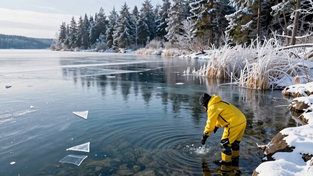 The water temperature is crucial because it directly influences your ice duration — the amount of time you can comfortably stay immersed. When the water is colder, your ice duration naturally shortens, often kept within 1 to 5 minutes. If you stay in longer than your body can tolerate, you risk hypothermia or frostbite, especially if your body isn’t acclimated to such cold. Conversely, if the water isn’t cold enough, you may find yourself staying longer, but you might not be getting the full benefits of cold exposure. The sweet spot is finding a temperature that challenges you without overwhelming your body, typically around 50°F to 55°F (10°C to 13°C), with an ice duration of about 2 to 3 minutes for most beginners. Additionally, understanding the importance of water temperature helps optimize your experience and safety during cold plunges. Recognizing the role of body adaptation can also aid in gradually increasing your tolerance for colder water over time. Incorporating gradual exposure into your routine is essential for safe progression and long-term benefits.