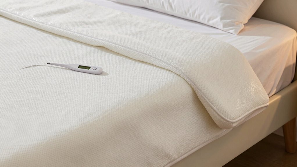 Have you ever wondered how your body heat influences the cooling performance of your mattress topper? Your body constantly transfers heat to the topper through conduction and convection. Gel technology helps manage this transfer by absorbing and dispersing heat more efficiently, keeping you cooler longer. Additionally, airflow design plays a vital role by promoting air circulation beneath and around your body, preventing heat buildup. These features work together to counteract the natural heat transfer from your body, making the cooling effect more effective. Moreover, understanding the biological factors that influence heat production can help you select a topper that better suits your needs. However, if your body generates more heat than the topper can dissipate, you might still feel warm. Understanding how heat transfer works helps you choose the right topper to maintain a cooler, more comfortable sleep environment all night.