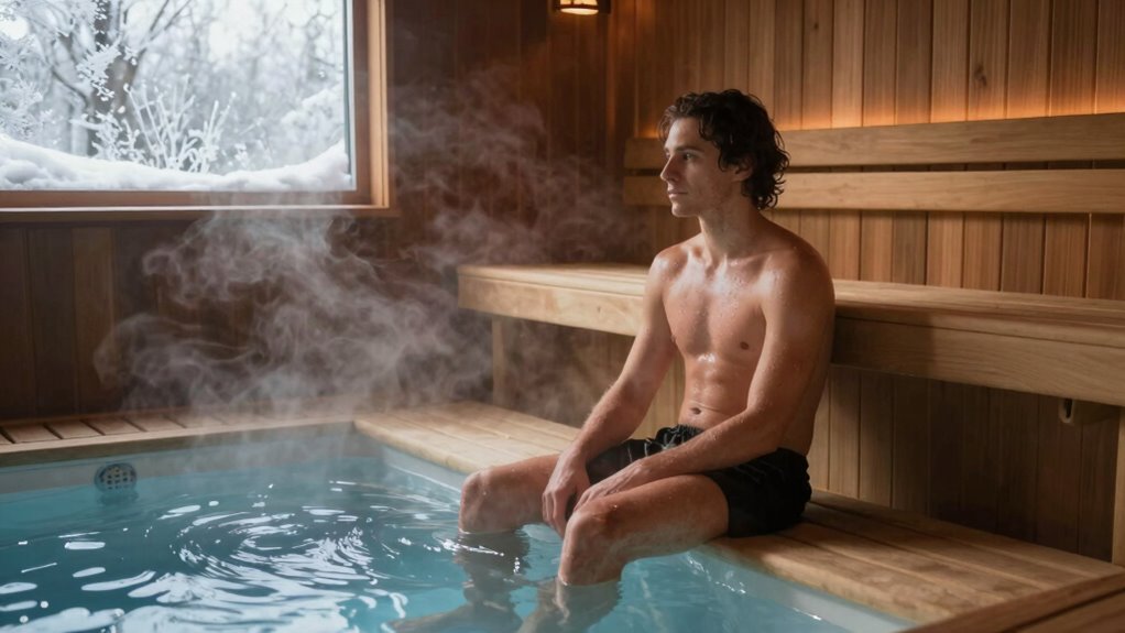 If you have heart conditions or skin sensitivities, you need to be especially cautious with rewarming after cold plunges. These conditions can make rapid temperature changes risky, potentially causing heart strain or skin irritation. Always consult your healthcare provider before using saunas, and opt for gentle rewarming. Keep the temperature moderate, listen to your body, and avoid sudden shifts in heat to guarantee safe, comfortable recovery.