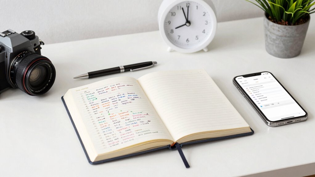 You should use tools like journaling apps, spreadsheets, or dedicated habit trackers to monitor your sessions. These tools help you log session duration and track goal progress efficiently. By recording how long you work and noting milestones achieved, you stay motivated and focused. Choose a tool that’s easy to update regularly, so you can quickly review your progress and make adjustments to boost your learning speed.