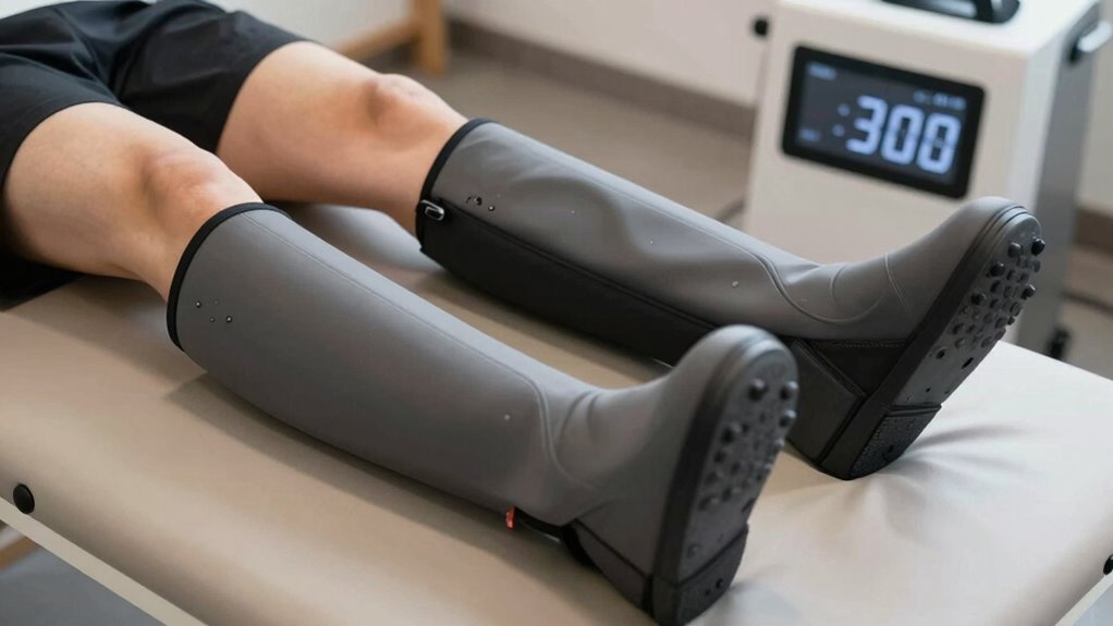 Properly timing your use of compression boots before an event can substantially enhance your performance and recovery. To optimize timing, consider how they help reduce muscle fatigue and promote circulatory enhancement, guaranteeing your legs are primed for action. Use them about 15-30 minutes before your activity to boost circulation without overstimulation. Avoid overdoing it, as too much compression might lead to unnecessary fatigue. Focus on how the boots prepare your muscles efficiently.
