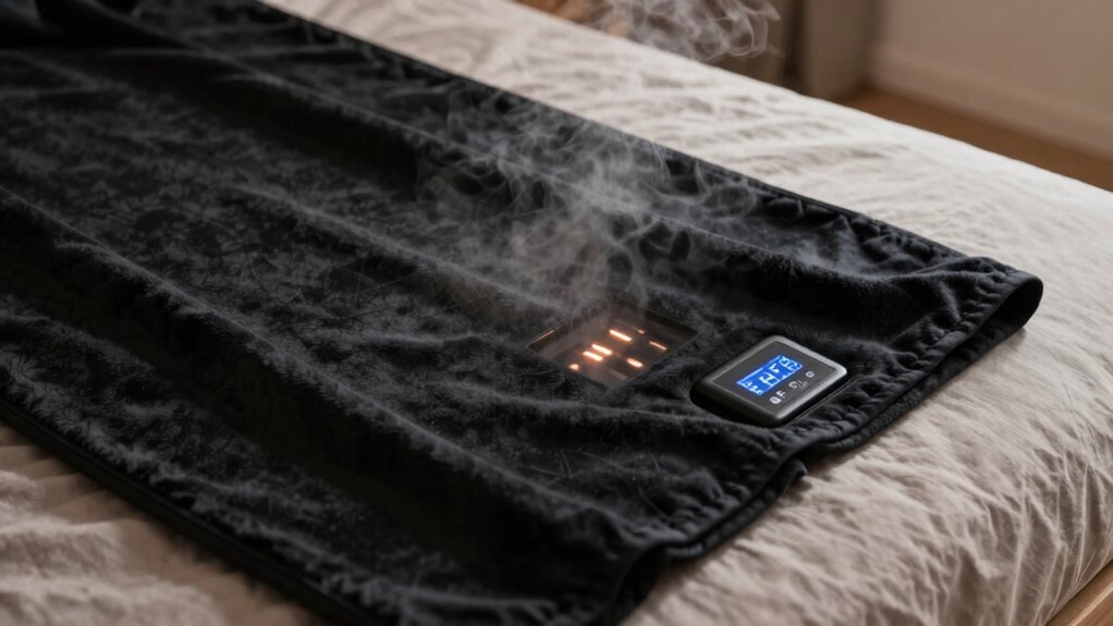 While sauna blankets are generally safe when used correctly, overheating can still occur if you ignore your body’s signals. If you notice dizziness, nausea, or excessive sweating, it’s time to act. Check for ventilation issues that may trap heat and reduce air circulation. Proper sweat management is vital—if you’re sweating excessively or feeling clammy, it’s a sign to cool down.