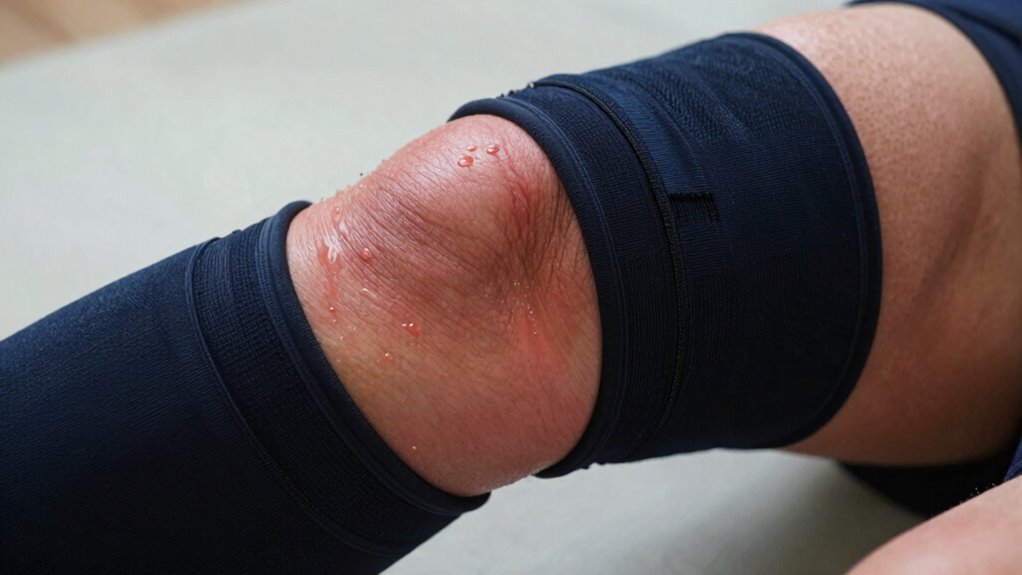 If you have skin allergies, compression gear might cause skin irritation or allergic reactions. The tight fit can trap sweat and bacteria, worsening irritation, especially if you’re sensitive to certain materials. Before wearing compression gear, check the fabric for hypoallergenic options or try a patch test on a small skin area. If irritation occurs, discontinue use and consult a dermatologist to find suitable alternatives that won’t trigger allergic reactions.