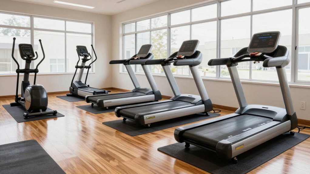 Proper placement of your cardio machine is essential because it directly impacts your comfort, safety, and workout effectiveness. When you position your equipment correctly, you ensure its stability, preventing unnecessary movement or wobbling that could cause accidents. Stability also helps protect your flooring from damage. Additionally, thoughtful placement can considerably reduce noise, making your workouts more pleasant for you and others in your home. Placing the machine on a flat, level surface and away from walls minimizes vibrations and sound transfer. Proper positioning not only enhances safety but also creates a more enjoyable exercise environment. Taking the time to find the right spot will maximize your workout efficiency while keeping your space quiet and secure. Considering Free Floating foundations can further improve stability and protect your flooring from damage. Incorporating floor protection measures like mats or platforms can also help prevent long-term wear on your floors. Proper equipment placement can also facilitate better airflow, preventing overheating during intense workouts. Ensuring adequate ventilation and airflow around your cardio equipment can help dissipate heat and keep you comfortable throughout your exercise session.
