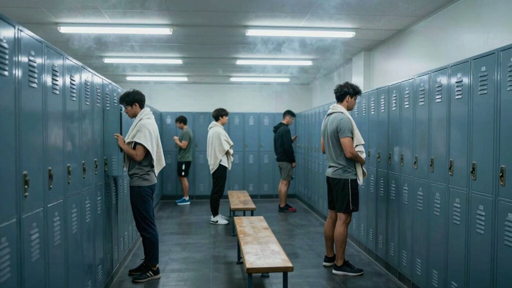 In shared cold exposure spaces like gyms, clubs, and community centers, respecting others is key. Always practice good hygiene by showering beforehand, disinfecting equipment, and using personal towels. Keep noise levels low to avoid disturbing others, communicate clearly about your plans, and seek permission when sharing gear. Stay aware of personal boundaries, maintain cleanliness, and be attentive to individual comfort and safety needs. Continuing guarantees you’ll learn more tips to create a respectful and enjoyable environment for everyone.
