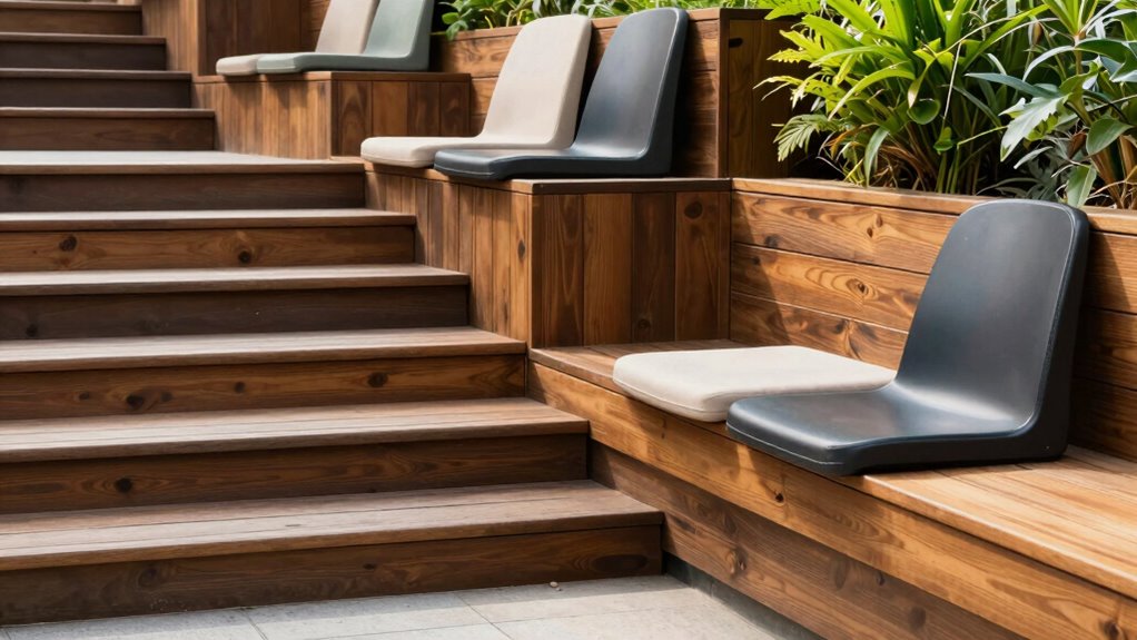 Have you considered how the right materials can make your steps, benches, and seats safer and more durable? Choosing weather resistant materials guarantees your outdoor features withstand the elements without deteriorating. Opt for durable options like treated wood, composite materials, or corrosion-resistant metals that resist rot, rust, and warping. Incorporate slip proof surfaces, such as textured finishes or rubberized coatings, to prevent accidents, especially in wet conditions. These surfaces provide added grip and stability, reducing the risk of slips and falls. Selecting high-quality, weather resistant materials not only extends the lifespan of your structures but also maintains their safety and appearance over time. Investing in durable, slip-resistant surfaces ensures your outdoor space remains safe, functional, and inviting for years to come.