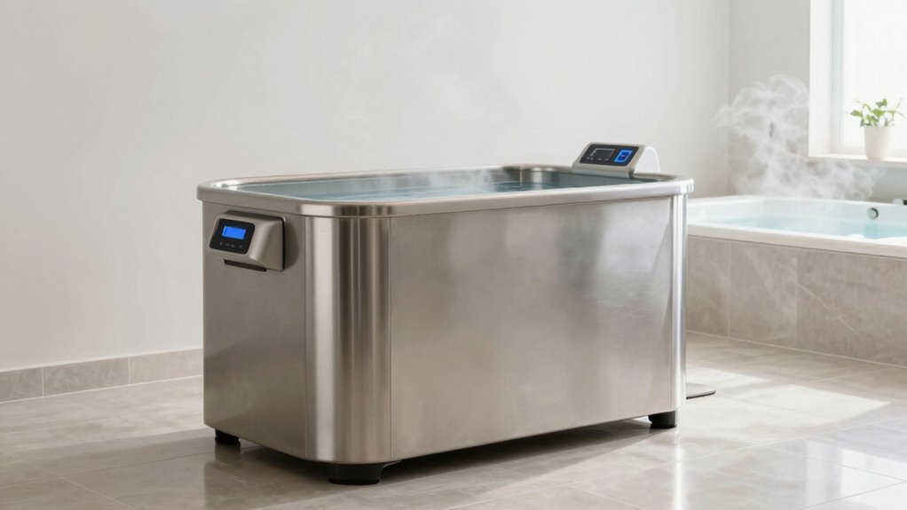 Coincidences happen, like noticing your chiller’s water filtration system needs regular checks. You should clean or replace filters periodically to keep water fresh and clear. Also, monitor noise levels to guarantee quiet operation, as loud sounds might indicate a problem. Regular maintenance includes inspecting hoses, checking refrigerant levels, and cleaning coils. Staying proactive prevents breakdowns, keeps your cold plunge running smoothly, and extends its lifespan.