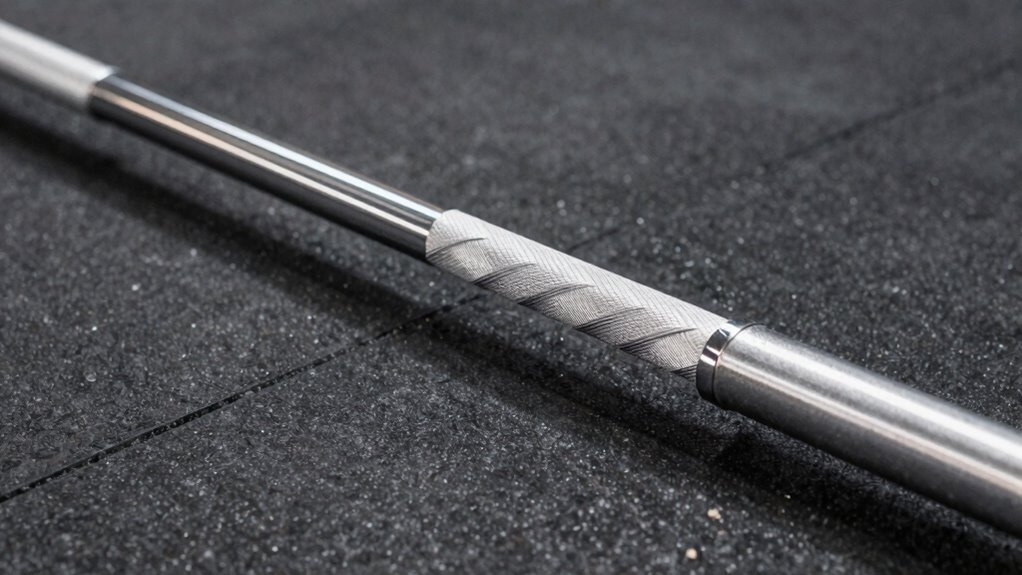 Your barbell material directly impacts knurling and whip. A steel bar with a higher carbon content offers better grip comfort and consistent knurling, ensuring you maintain control during lifts. Lighter, more flexible materials like aluminum result in increased whip, which can affect stability. Heavier bars tend to have less whip, providing a steadier feel, while the material’s density influences how much the bar bends under load, affecting your grip and lift precision.