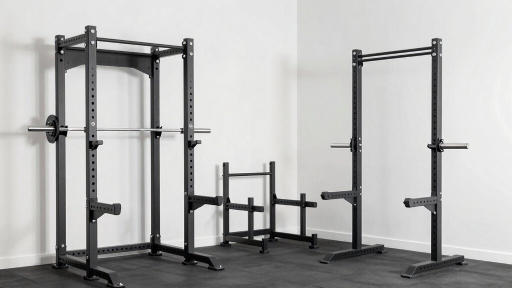 While power racks, squat racks, and half racks all serve the purpose of supporting weightlifting exercises, they differ substantially in design and functionality. Power racks offer the highest equipment versatility, allowing you to perform a wide range of lifts, including bench presses, squats, and pull-ups. They typically feature full safety features like adjustable safety bars and multiple attachment points, ensuring your safety during heavy lifts. Additionally, home workout versatility is greatly enhanced with a power rack due to its adaptability to various exercises and accessories. Many models also incorporate integrated pull-up bars and storage options, further expanding their functional capabilities. The presence of adjustable components in power racks allows for customization to suit different user heights and workout types, making them highly adaptable for comprehensive training routines. When considering space requirements, power racks tend to be larger but offer more comprehensive training options compared to other racks. Squat racks are more basic but still provide essential support for squats and other lower-body movements, often with fewer safety options. Half racks focus mainly on squats and presses, with limited safety features. Your choice depends on your workout needs, but power racks excel in versatility and safety, making them ideal for extensive home gyms.