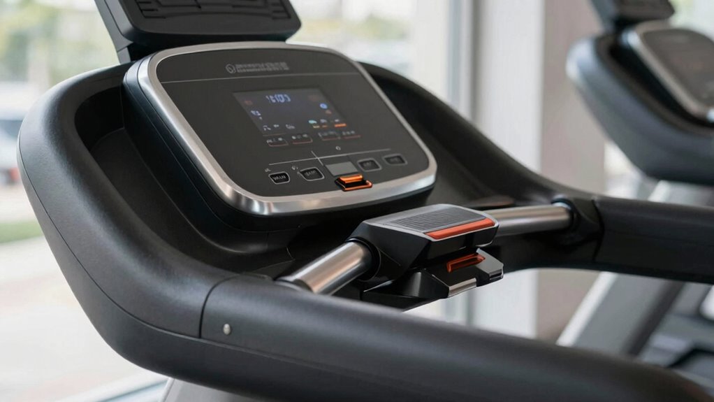 While horsepower determines a treadmill’s capability to handle speed and incline, several other features can substantially influence your workout experience. Motor noise is a critical factor; a quieter motor creates a more comfortable environment, especially if you work out early mornings or late nights. Energy efficiency also matters; a treadmill that consumes less power helps keep your running costs lower and reduces environmental impact. Look for models with energy-saving features like automatic shut-off or eco-mode. These elements can make your exercise sessions more pleasant and cost-effective, often outweighing the importance of raw horsepower. Prioritizing motor noise and energy efficiency ensures a smoother, quieter workout that’s easier on your budget and your nerves.
