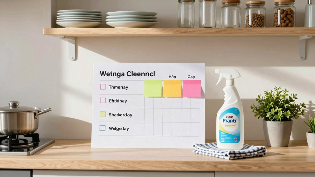 Creating a weekly cleaning routine that fits your schedule starts with setting realistic time blocks for each task. Effective time management relies on breaking tasks into manageable chunks, so you don’t feel overwhelmed. When goal setting, be honest about how much time you can dedicate without sacrificing other priorities. Allocate specific periods for cleaning, such as 15-minute daily tidies or a dedicated hour on weekends. Avoid overestimating your availability, which can lead to missed tasks and frustration. Instead, start small and adjust as needed. Consistent, achievable time blocks help you stay committed and build momentum. Remember, the goal is progress, not perfection. By setting realistic time limits, you create a routine that’s sustainable and easy to follow.