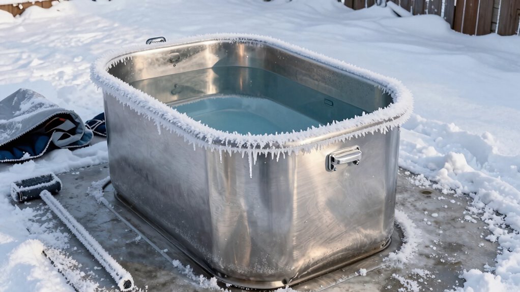 If you don’t winterize your cold plunge, freezing temperatures can cause serious damage. Water expanding as it freezes can crack the tank and damage internal components, leading to costly repairs. Proper winterization involves draining the water and applying appropriate chemical treatments to prevent algae growth and bacterial buildup during the off-season. These treatments also help maintain the aesthetic upkeep of your cold plunge, keeping it clean and looking new when you reopen it. Failing to winterize can result in mineral buildup and corrosion, which compromise the unit’s longevity. Additionally, innovative cooling technology can help regulate temperature fluctuations and protect your equipment during colder months. Incorporating advanced insulation into the design can further reduce the risk of freeze damage by maintaining stable temperatures around your unit. Using proper winterization techniques ensures that all vulnerable components are protected from the harsh weather conditions. Implementing temperature monitoring systems can provide real-time alerts to prevent unexpected freezing issues. To further safeguard your investment, consider periodic maintenance checks to identify potential vulnerabilities before winter sets in. By taking time to prepare your cold plunge for winter, you protect your investment, ensure it operates smoothly next season, and save yourself from unnecessary repairs caused by freeze damage.