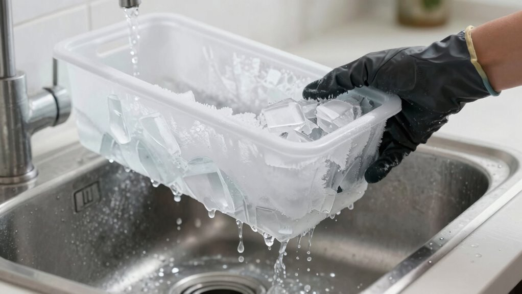 Once you’ve cleared away loose ice and cleaned your freezer, the next step is to drain the excess water from the defrosting process. Proper drainage ensures good air circulation and helps maintain ideal temperature control, preventing ice buildup and odors. To do this effectively: