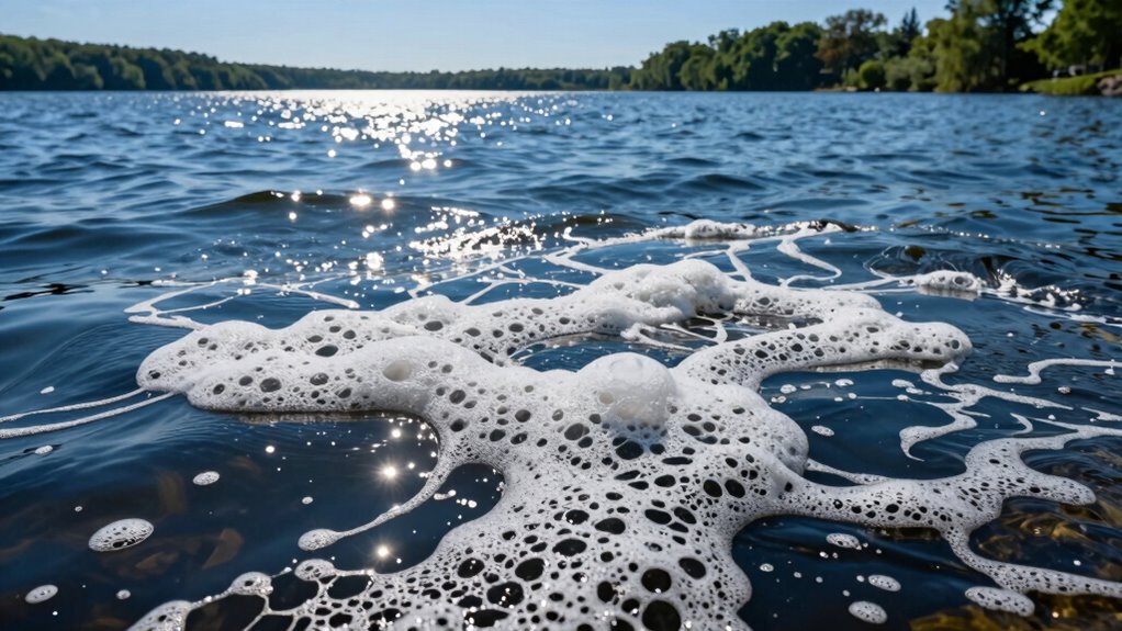 Like a sudden soap bubble in a stream, foam doesn’t always signal pollution. Natural foam can form from organic matter decomposing, acting as a chemical indicator of healthy processes. However, persistent or unusual foam might hint at pollutants or chemical runoff. You should observe the foam’s appearance and duration, and consider testing the water if it seems abnormal. Not all foam is harmful, but awareness helps protect your water environment.