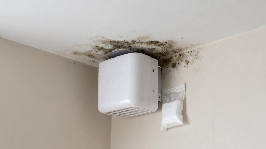 Using moisture absorbers can be a highly effective way to keep humidity levels in check and prevent mold growth around your setup. These small, portable devices trap excess moisture, aiding in humidity control and mold prevention. Place them in spots prone to dampness, like corners or near equipment. To visualize, consider this setup: