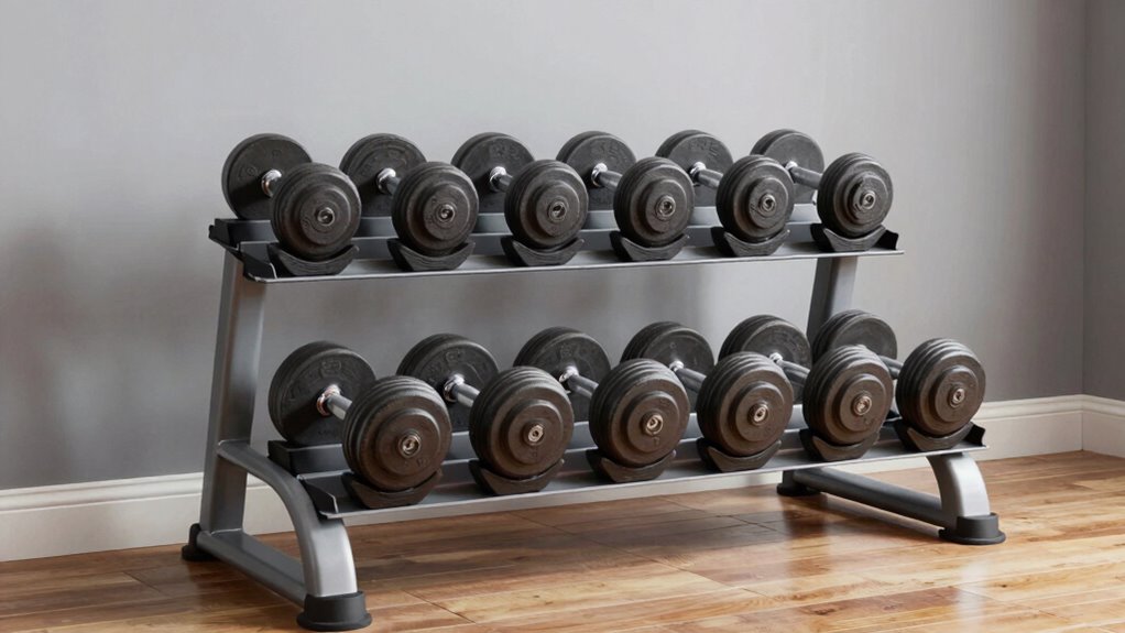 Maximizing space is essential when selecting adjustable dumbbells for a home gym, especially if your area is limited. These dumbbells typically occupy less than 2 square feet, making them perfect for small spaces. Their detachable or compact design allows quick assembly and disassembly, reducing storage needs when not in use. Multi-functional models can transform into different workout tools, eliminating the need for multiple weights and saving even more space. Their ergonomic, slim profiles make them easy to store under beds, in closets, or on shelves without cluttering your workout area. Despite being lightweight for easy handling, these dumbbells are durable and built to perform. Overall, space-efficient dumbbells are a smart choice for anyone wanting versatile, effective weights that don’t take up much room.