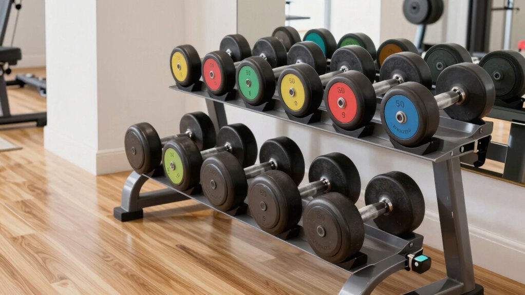 When evaluating dumbbell sets under $3000, it’s essential to think about both price and overall value. I look for sets made from high-quality materials that guarantee durability and long-term use, saving me money in the long run. A variety of weights within the 5-50 lb range offers better value, allowing me to progress and target different muscle groups. Bundled options with storage racks or organization features also boost value by saving space and making workouts more efficient. Comparing the price per pound helps me identify the most cost-effective options tailored to my needs. In conclusion, choosing reputable brands with positive reviews gives me confidence in quality and customer support, guaranteeing my investment pays off over time.