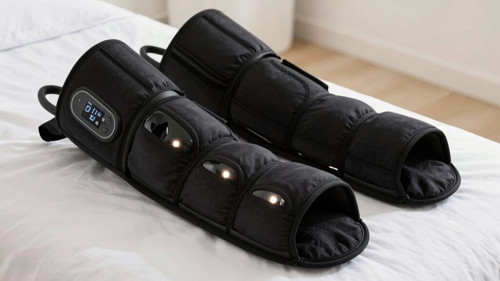 With so many therapy modes available, it’s important to evaluate how each one targets specific leg recovery needs. Different modes like auto, pinch, press, sequence, circulation, and combinations provide focused relief for various conditions. Some devices integrate multiple massage techniques, including kneading, squeezing, and wave-like compression, mimicking professional massage therapists. Adjustable modes let you customize your experience based on activity level, discomfort, or recovery goals. Having multiple options ensures you can target pain relief, muscle relaxation, or improved circulation effectively. This variety creates a thorough approach to leg recovery, addressing both relaxation and therapeutic needs. Choosing a device with versatile therapy modes allows you to tailor your sessions for maximum benefit, ensuring your recovery process is both effective and comfortable.