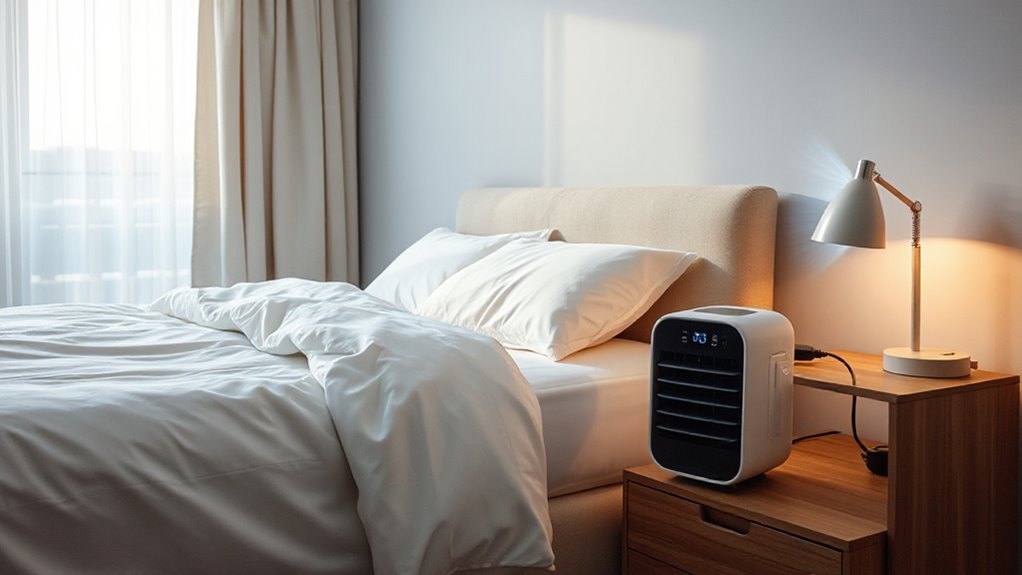 Choosing the right bed cooling system depends on understanding the different cooling methods available, as each offers unique benefits and considerations. Water-based systems circulate chilled water through mattress toppers or pads, delivering precise and consistent temperature control directly at the sleep surface. They’re excellent for those who want targeted cooling but may require more setup and maintenance. Air circulation fans improve comfort by directing airflow under or around the bed, with adjustable speed and direction—great for quick, customizable relief. Phase change materials passively absorb and release heat, maintaining a steady temperature without moving parts or water. When selecting a cooling method, consider factors like energy use, noise levels, setup complexity, and how well it suits your preferred sleep environment. Each method offers distinct advantages tailored to different needs.