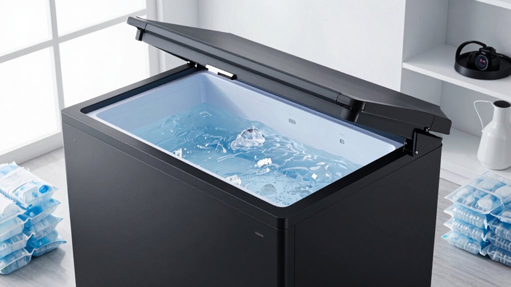 A quiet freezer can make a big difference in creating a relaxing cold plunge experience. When choosing a chest freezer, pay attention to its noise level; ideally, it should operate below 40dB. Freezers running around 38-40dB, similar to a quiet library, won’t disturb your peaceful environment. Higher noise levels above 50dB can be distracting or even uncomfortable, disrupting your focus and relaxation. Consider how close your freezer will be to your living or wellness space—less noise means less disturbance. Opting for models with sound insulation or quieter compressors can dramatically reduce operational noise. This guarantees your cold plunge sessions remain tranquil, without unwanted background noise, and enhances your overall experience.