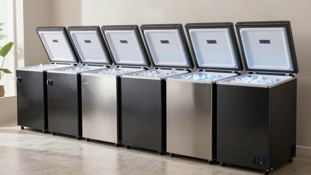 Choosing an energy-efficient chest freezer can substantially cut down your long-term operational costs while keeping your ice baths consistently cold. Look for models with the ENERGY STAR certification, which guarantees high energy efficiency standards. Good insulation, especially thick, quality materials, helps retain cold temperatures and reduces energy consumption. Advanced temperature controls and programmable settings allow you to optimize energy use during idle times, saving money and reducing wear. Regular maintenance, like defrosting and sealing gaps, also plays a vital role in maintaining efficiency and prolonging the freezer’s lifespan. Investing in an energy-efficient model not only lowers your electricity bills but also supports eco-friendly practices. Overall, prioritizing energy efficiency guarantees sustainable operation and consistent performance for your ice bath setup.