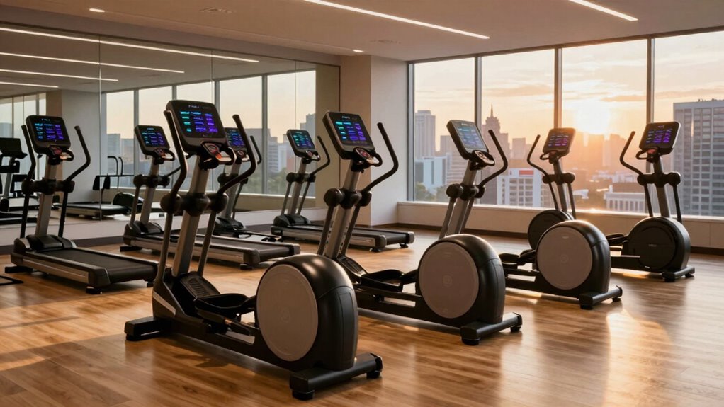 When selecting an elliptical machine, motion smoothness and noise levels are essential for a comfortable workout experience. A smooth motion depends on a high-quality, low-resistance flywheel and precise calibration of the drive system, ensuring fluid movement. Magnetic resistance systems generally operate more quietly than friction-based ones, often producing noise below 20 decibels, which is ideal for home use. The stride path and handlebar design also influence how natural and fluid your workout feels. Durable bearings and sliding rails made from high-precision materials reduce mechanical friction, boosting smoothness and minimizing noise. Proper assembly and regular maintenance—like tightening bolts and lubricating moving parts—are imperative for maintaining consistent motion and quiet operation over time.