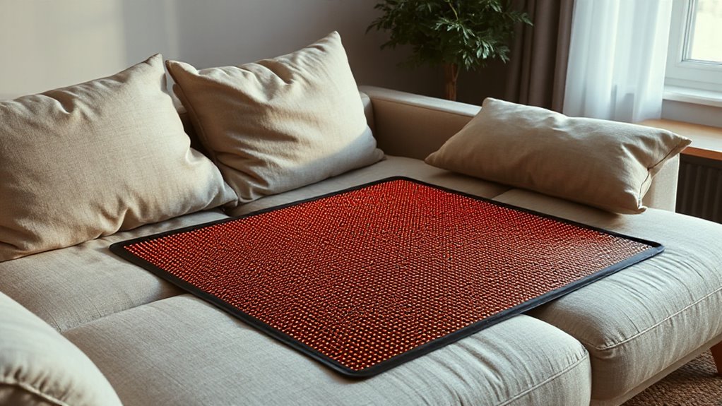 Choosing the right far infrared heating mat involves more than just picking a model at random; it requires considering several key factors to make certain you get the most benefit safely. First, verify the mat emits far-infrared rays with a wavelength of 8-15μm, which allows for deep tissue penetration. Natural gemstones like jade or tourmaline can boost infrared warmth and negative ion emission, enhancing therapeutic effects. Check that the size and coverage area match your intended use, whether targeting specific body parts or full-body relaxation. Adjustable temperature controls are essential for customizing comfort and safety. Finally, safety features like auto shut-off, overheating protection, and an EMF-free design help ensure safe, long-term use without worries. These factors are crucial for an effective, safe experience.