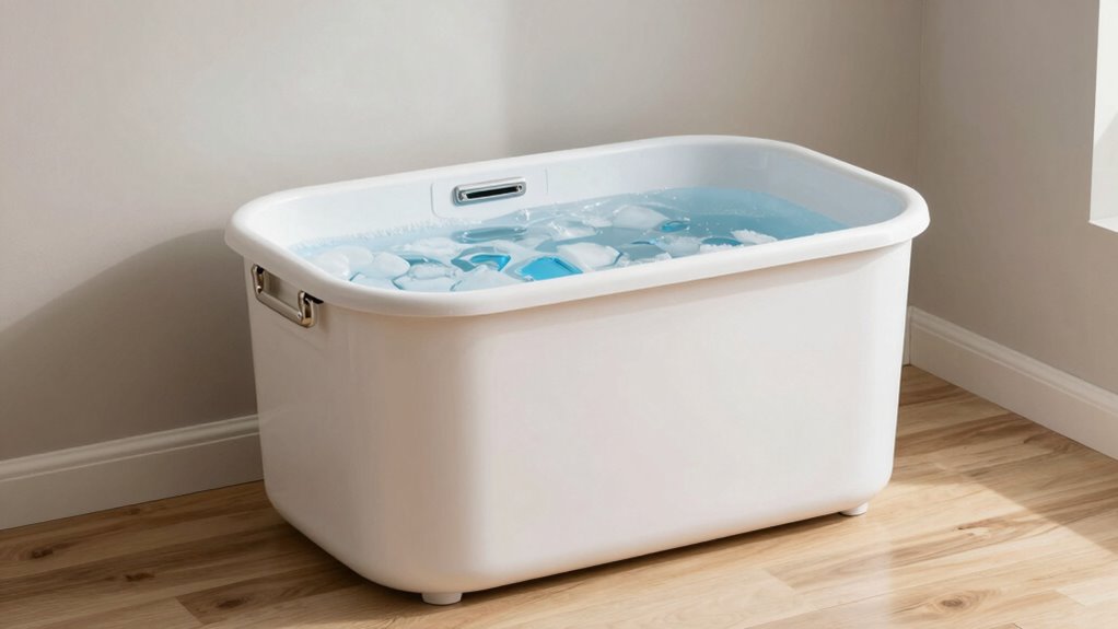 Foldable ice bath tubs come with essential safety features like non-slip bases, reinforced seams, and secure locking mechanisms to prevent accidental collapse. Some also include drainage valves for quick emptying and stable handles for easy transport. I always check for sturdy materials and safety certifications before purchasing. These features guarantee I can enjoy my cold therapy sessions confidently, knowing I’m protected from common hazards and accidents.