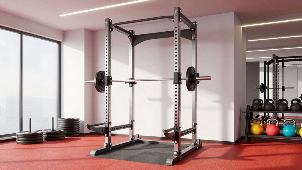 When selecting a half rack, pay close attention to its adjustability features, as they directly impact your workout flexibility and comfort. Look for racks with multiple height adjustment points—ideally from 13 to 28 positions—to accommodate different exercises and user heights. Adjustable safety spotter arms and J-hooks are essential for customizing the height and positioning for lifts like squats and bench presses. Check if the rack offers adjustable width settings to fit your space and barbell sizes. Ease of adjustment is also critical; models with pin or knob mechanisms allow quick, secure changes during your workout. Additionally, some racks feature adjustable plate holders and accessory mounts, letting you tailor your setup for a more efficient training session.