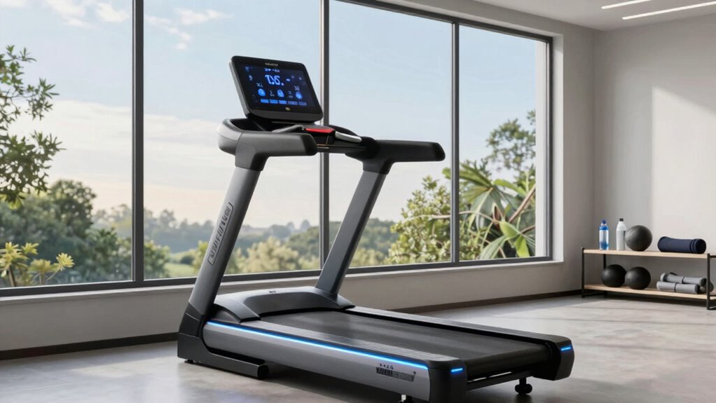 A treadmill’s space-saving design can make or break its suitability for your home gym, especially if space is limited. Foldable models are a game-changer, as they reduce their footprint when not in use, allowing for easy storage. Many come with transport wheels, so moving and stowing them is effortless. Slim profiles and minimalistic structures help these treadmills fit seamlessly into small living or workout areas without cluttering your space. The ability to fold the deck vertically or horizontally maximizes storage options, making them ideal for apartments or multi-purpose rooms. Some models even incorporate multi-functionality, like built-in workout modes and accessories, in a compact frame. This thoughtful design guarantees you get effective training without sacrificing precious space.