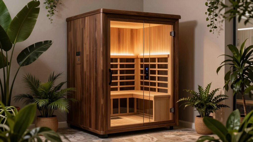 You might worry compact infrared saunas waste energy, but I’ve found they’re quite efficient. Their smaller size means less heat loss, so they use less power overall. Plus, many models have energy-saving features like automatic shut-off and adjustable timers. I’ve personally noticed that they warm up quickly and maintain temperature without running the heater constantly, helping save on electricity bills while still giving me a relaxing, effective sauna experience.