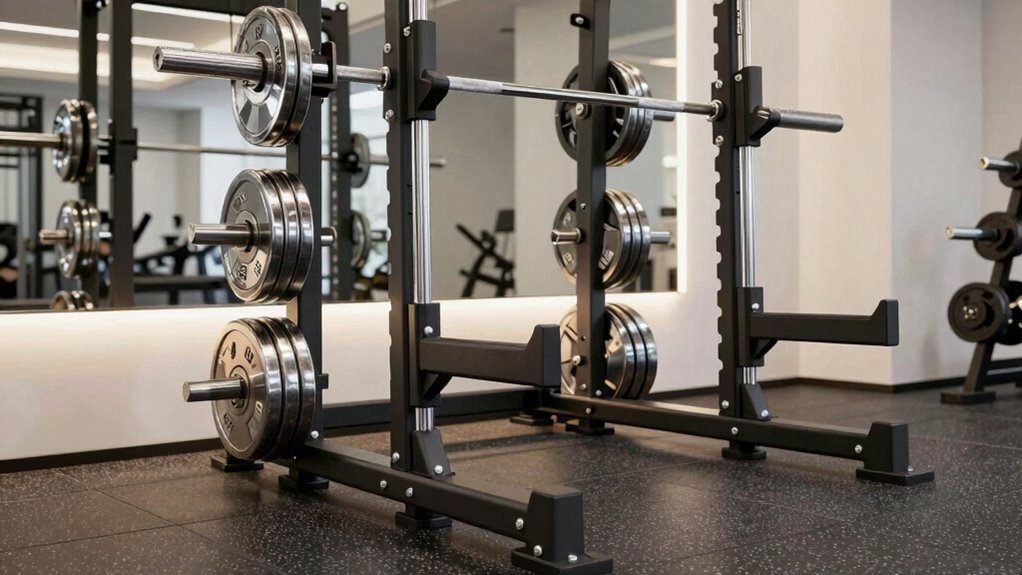Choosing the right Olympic weight set with a rack for your home gym starts with evaluating your space. You need to measure your available floor area to ensure everything fits comfortably without overcrowding. Pay attention to the rack’s footprint—its height, width, and depth—to maximize space efficiency. If your area is limited, consider space-saving options like foldable or compact racks that can be stored easily when not in use. It’s also essential to leave enough clearance around the equipment for safe movement and proper exercise execution. Additionally, look for multi-functional racks that include built-in storage or extra features to make the most of your space. Proper planning here helps create a safe, functional, and enjoyable workout environment.