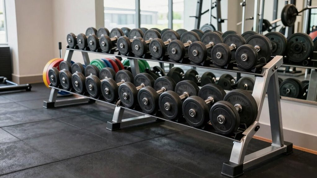 Maximizing space efficiency is essential when choosing an Olympic weight set with a rack under $3000, especially if you have limited workout area. Compact designs like foldable benches and multi-functional racks help you make the most of your space while still offering diverse workout options. Vertical storage solutions for plates and bars keep your area organized and clutter-free. Equipment with integrated storage compartments eliminate the need for extra furniture or racks, saving valuable room. Multi-purpose units that combine squat racks, pull-up bars, and cable systems allow for a variety of exercises without crowding your space. Additionally, adjustable and foldable equipment provides flexibility, making it easy to store when not in use and optimize your workout area efficiently.