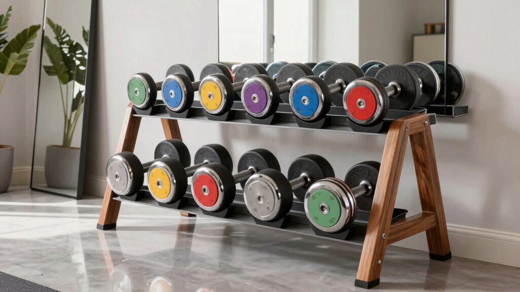 Choosing a dumbbell set that fits well with my home gym rack starts with checking compatibility. I need to verify the set matches the rack’s dimensions and weight capacity to avoid overcrowding or instability. It’s also important to confirm if the rack is designed for hex, round, or Olympic-style dumbbells, so the head shape and handle size align. I look at the rack’s spacing and tier design to affirm it can accommodate the range of weights I want, especially the smaller or larger ones. The rack’s material and build quality should support the full set’s weight without bending or wobbling. Lastly, I consider whether the rack has adjustable or modular features, allowing me to expand or customize storage as my collection grows.