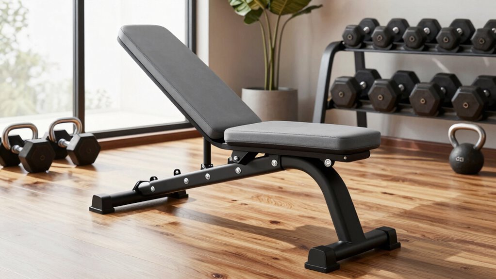 A highly versatile adjustable weight bench can considerably expand your workout options by allowing you to perform a variety of exercises targeting different muscle groups. Benches with multiple incline, decline, and flat positions provide the flexibility to customize your routines, with some offering up to 36 adjustable angles. A multi-position backrest enables exercises like bench presses, shoulder presses, sit-ups, and leg lifts, making your workouts more comprehensive. The ability to quickly switch between angles supports efficient transitions, saving time during full-body sessions. Additionally, foldable designs with adjustable components maximize space, making them ideal for limited home gyms. Overall, exercise versatility ensures you can target multiple muscles and adapt your workouts as your fitness level progresses.