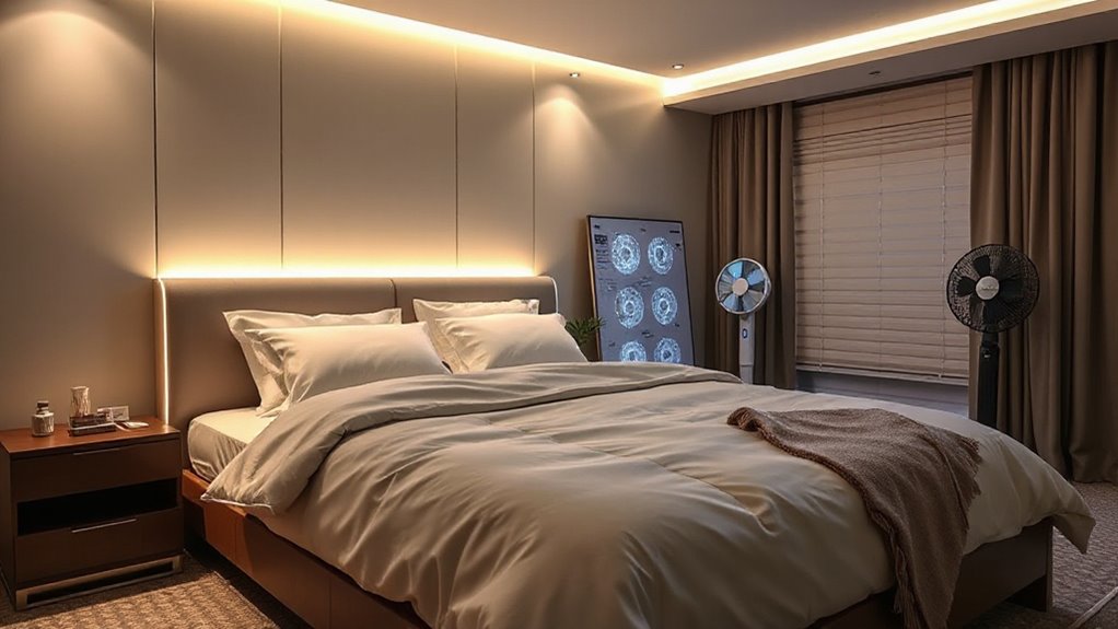 Choosing a premium bed cooling system hinges on its ability to effectively lower surface temperatures and provide immediate relief from heat. I look for systems that can reduce surface temperatures by 3 to 12°F, ensuring quick comfort. Water circulation systems often outperform traditional air cooling by using just 6 to 8 watts, making them energy-efficient options. Advanced technologies like EvapoChill and SuperBlue boost cooling performance over 200%, greatly enhancing comfort. The way cooling is distributed—whether through uniform water flow or targeted airflow—also impacts effectiveness. Additionally, features like adjustable modes and auto-timers let me customize cooling intensity, ensuring I get the right level of relief when I need it most. Overall, technology effectiveness directly influences sleep quality and satisfaction.