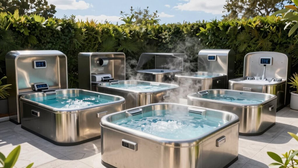When selecting a cold plunge tub, I consider factors like cooling power and how quickly it can lower the water temperature, since efficiency matters. I also look at the size and capacity to guarantee it fits my space and meets my needs, along with the water circulation system for maintenance ease. Finally, I evaluate insulation, energy use, and setup requirements to find a model that’s both effective and convenient to operate.