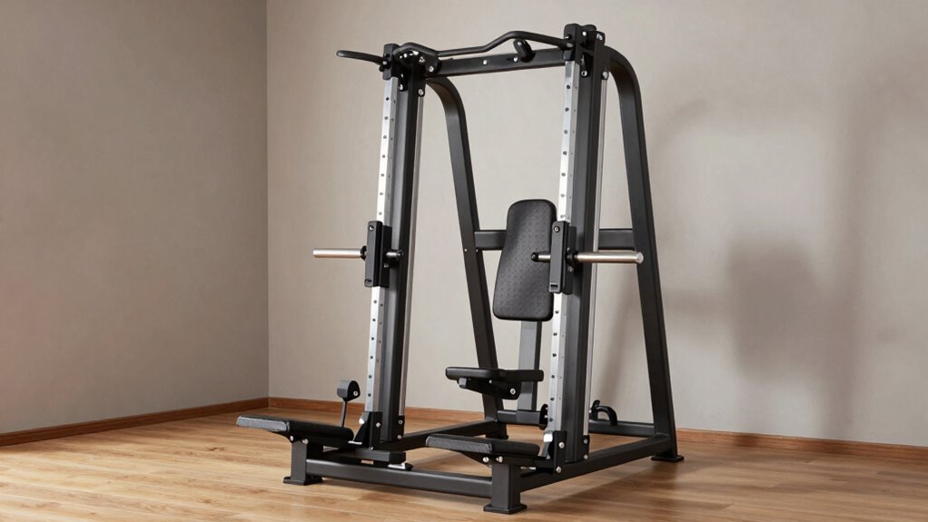 Choosing a premium hack squat machine for your home gym hinges largely on its build quality and durability. High-quality machines are made from heavy-duty steel or reinforced alloys, designed to handle intense workouts and frequent use without faltering. Features like sealed ball bearings, corrosion-resistant coatings, and sturdy welding joints considerably extend the machine’s lifespan by preventing wear and tear. A stable, wide base with reinforced supports ensures safety during heavy lifts, giving you confidence with each session. Premium models also include high-density foam padding and wear-resistant upholstery, resisting cracking and tearing over time. Precise manufacturing standards, such as tight tolerances and strict quality control, minimize mechanical issues and guarantee a long-lasting, reliable piece of equipment for your home gym.