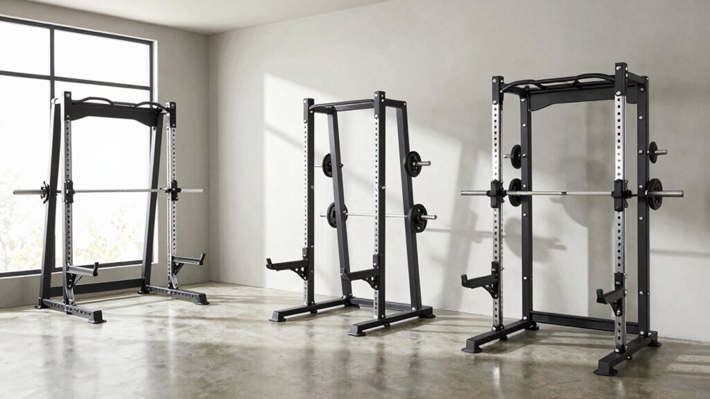 Choosing a versatile half rack means prioritizing models that support a variety of exercises, from squats and bench presses to pull-ups and dips. Look for racks with attachments like pull-up bars, dip stations, landmine attachments, and safety spotter arms, which expand your workout options. Compatibility with accessories such as resistance bands and weight plate storage adds customization and allows for progressive overload. Adjustable features like height and width guarantee a comfortable fit for users of different sizes and skill levels. A high-quality rack with multiple attachment points makes exercise progression seamless and broadens your routine without extra equipment. Overall, a versatile half rack maximizes functionality, helping you optimize your home gym for holistic strength training.