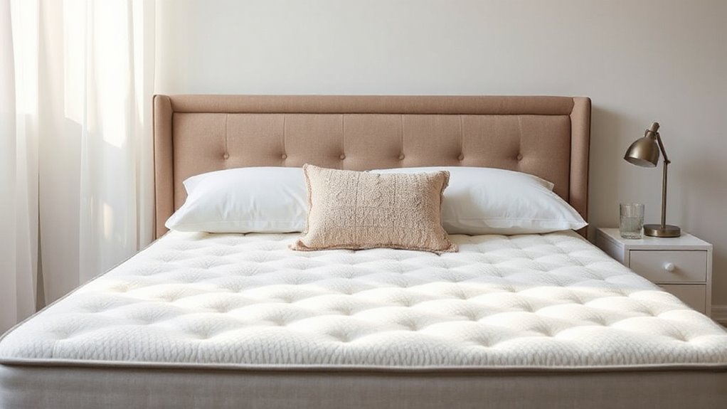 Ensuring a cool, comfortable sleep environment is essential, especially if you tend to overheat at night. A premium hybrid mattress with effective temperature regulation uses breathable materials like organic cotton, gel-infused foams, and open-coil designs to improve airflow. Gel memory foam layers help dissipate heat and keep the surface cool by dispersing body heat throughout the night. Open-coil support systems or breathable foam layers create natural air channels, preventing heat buildup. High-quality knitted fabrics and moisture-wicking covers also help maintain a dry, comfortable environment. Proper temperature regulation reduces night sweats and overheating, leading to deeper, more restorative sleep. When choosing a hybrid mattress, prioritize these features to ensure you stay cool and comfortable all night long.