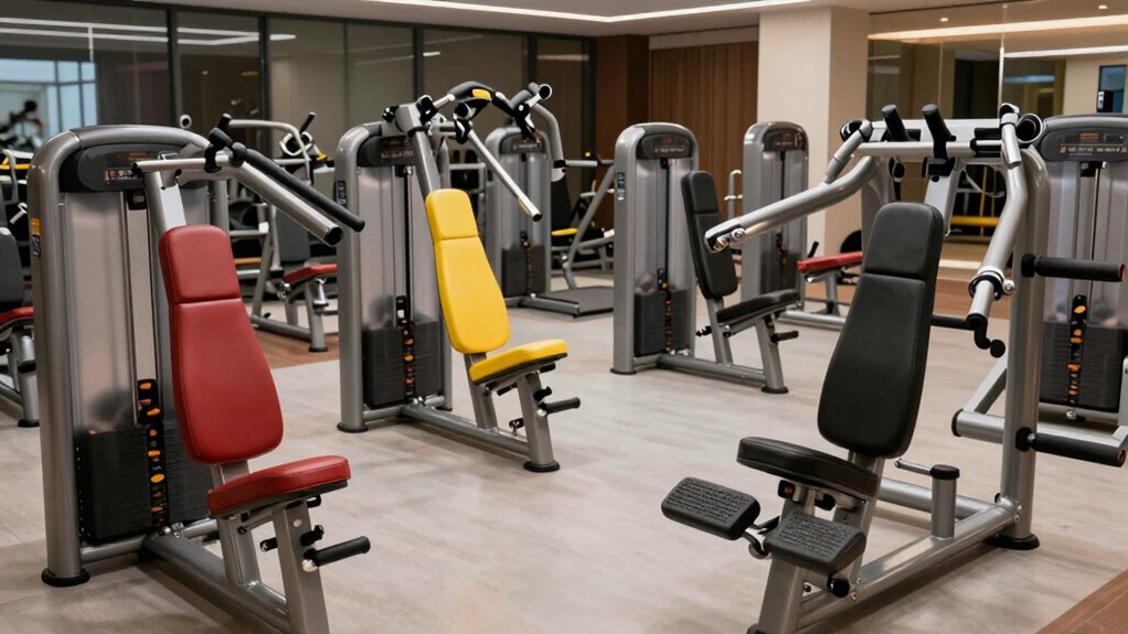 Premium leg press machines include safety features like adjustable stops that prevent overextension, non-slip footplates for secure footing, and sturdy safety rails to catch the weight if needed. I also appreciate the locking mechanisms that secure the seat and platform, reducing injury risk. These features give me confidence during intense workouts, knowing I’m protected while pushing my limits safely.