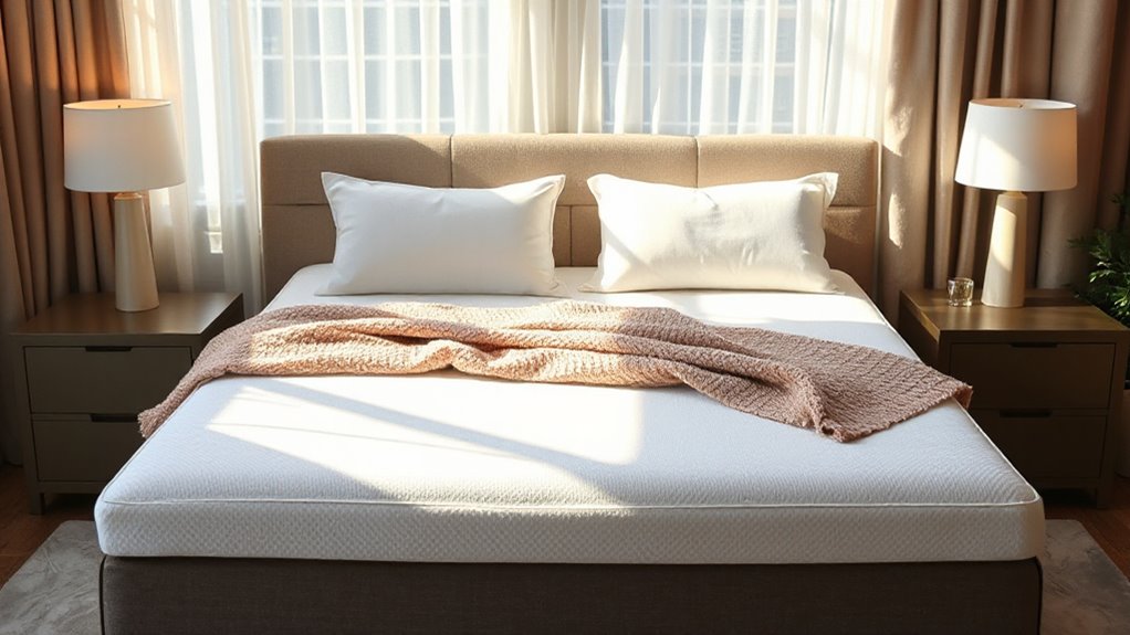 Imagine sinking into a cloud that stays cool and supportive all night—that’s what gel-infused memory foam offers. It helps regulate temperature, preventing overheating and keeping you comfortable. This type of foam also reduces pressure points, easing aches and pains. Plus, its hypoallergenic properties make it a healthier choice for sensitive sleepers. If you want restful, rejuvenating sleep, gel-infused memory foam might just be your perfect match.
