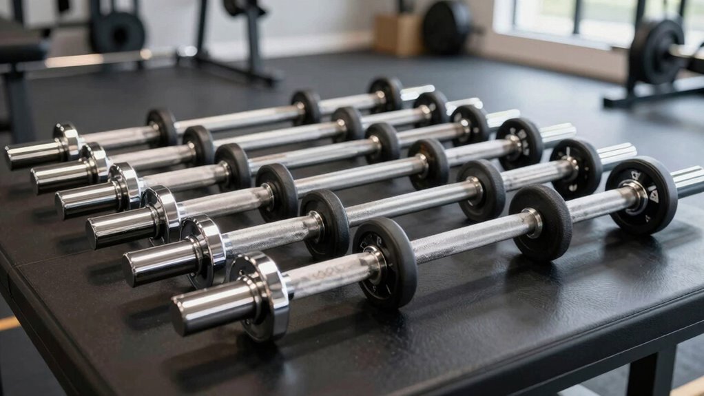 Ensuring your barbell is compatible with your weight plates is essential for safe and efficient lifting. Look for a bar with 2-inch sleeves, which are standard for Olympic plates. Make sure the sleeve diameter matches your plates’ bore size, usually 50mm, to guarantee a secure fit. Check that the bar’s length and sleeve dimensions accommodate various plate sizes without wobbling or slipping. Compatibility also means confirming your chosen bar fits well with your existing setup, like your power rack or bench. Additionally, prioritize bars with sleeves designed for easy loading and unloading—smooth rotation and high-quality bearings make this process effortless and safe. Proper compatibility guarantees a safer lifting experience and helps you make the most of your home gym investments.