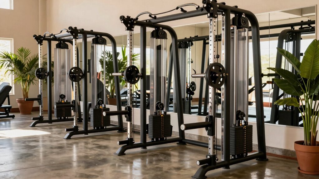 To maximize your home gym’s effectiveness, selecting a Smith machine that offers extensive exercise support is essential. A versatile unit should enable you to perform a variety of movements, including squats, bench presses, pull-ups, and cable-based exercises, targeting multiple muscle groups. Adjustable features like multiple height settings and attachments let you customize routines to fit your goals. Compatibility with accessories such as dip handles, T-bars, and resistance bands further expands your workout options. Incorporating dual pulley systems or multi-station configurations allows for simultaneous exercises or multi-angle training, boosting efficiency. A high-quality Smith machine should support both free-weight and machine-based exercises, offering comprehensive versatility within a single, adaptable piece of equipment.