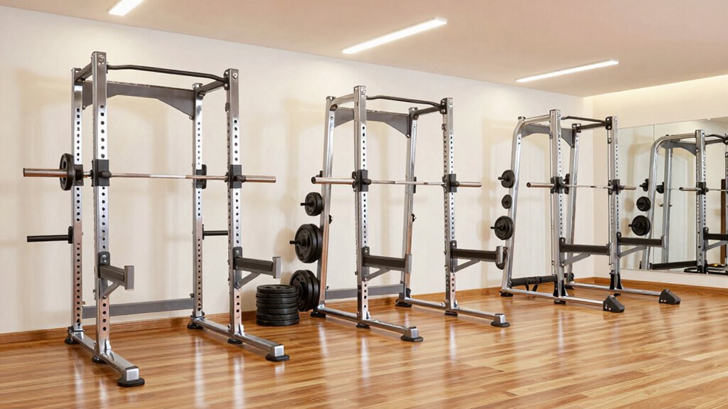 Maximizing workout space is key when selecting a premium squat rack for a home gym, especially if your area is limited. Space-efficient racks are designed to optimize your available floor space without sacrificing functionality. Features like foldable designs, compact footprints, and integrated storage help you make the most of small areas. Adjustable height and width settings add versatility, allowing the rack to fit various exercises and user sizes in confined spaces. Dual-function racks with built-in attachments or combined systems further save space by reducing the need for multiple pieces of equipment. To guarantee the rack fits seamlessly, pay close attention to detailed dimension specifications and layout plans. A well-designed space-efficient rack can transform even a modest gym into a functional, effective workout area.