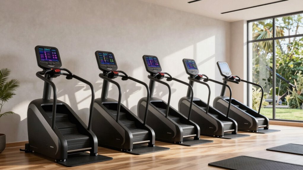 Top-tier stair climbers include safety features like sturdy handrails for stability, automatic shut-off systems if the machine detects overheating or unusual activity, and non-slip pedals to prevent slips. Many also have emergency stop buttons within reach and reinforced frames for durability. I feel confident using these machines knowing they’re designed with safety in mind, so I can focus on my workout without worry.