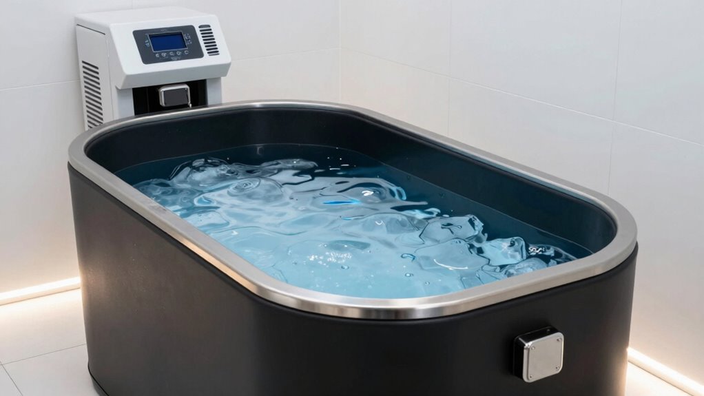 Did you know that high-end cold plunge systems can be up to 30% more energy-efficient than standard models? I’ve found that premium tanks with chillers often feature advanced insulation, energy-saving compressors, and smart controls that optimize power use. These design elements help reduce energy consumption while maintaining precise temperatures. So, investing in a top-tier system not only benefits your health routine but also keeps energy bills lower.